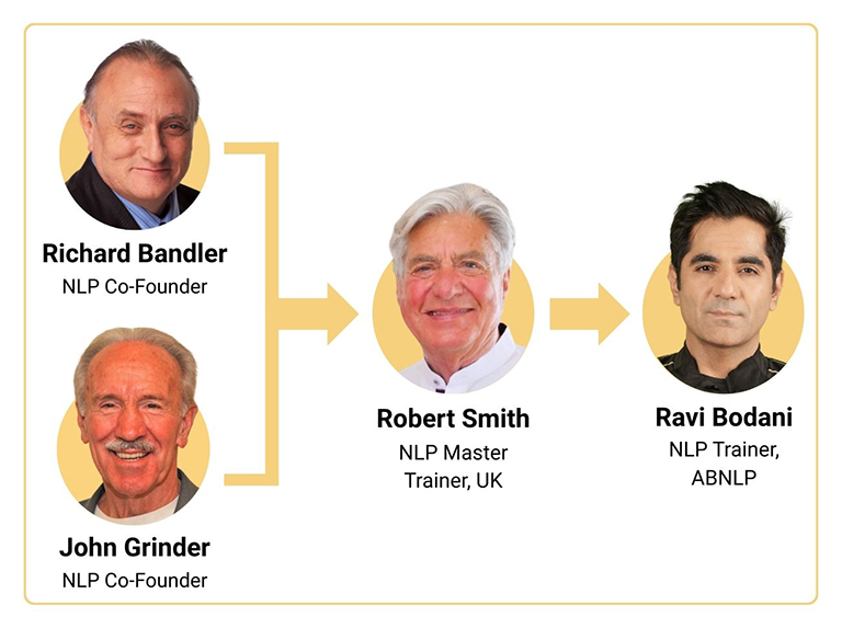 Trained under Robert Smith (NLP Master Trainer, UK), whose lineage connects directly to Richard Bandler and John Grinder – the founders of Neuro-Linguistic Programming (NLP), Ravi Bodani brings you a certified NLP training experience that’s both original and globally accredited.